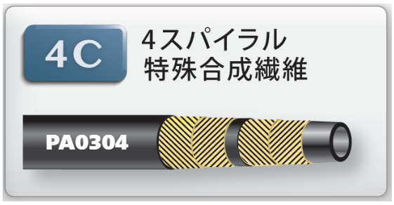 『パスカラートシリーズ』は、鉱物性作動油用のゴムホースです。寿命、耐疲労性を重視しており、また小さい曲げ半径により、コンパクトな油圧配管ができます。内管は耐油性合成ゴム、外被は耐候性合成ゴムと耐摩耗耐候性合成ゴムでできており、ポンプ定格圧力1.5~34.5MPaまでの9ランクがあります。